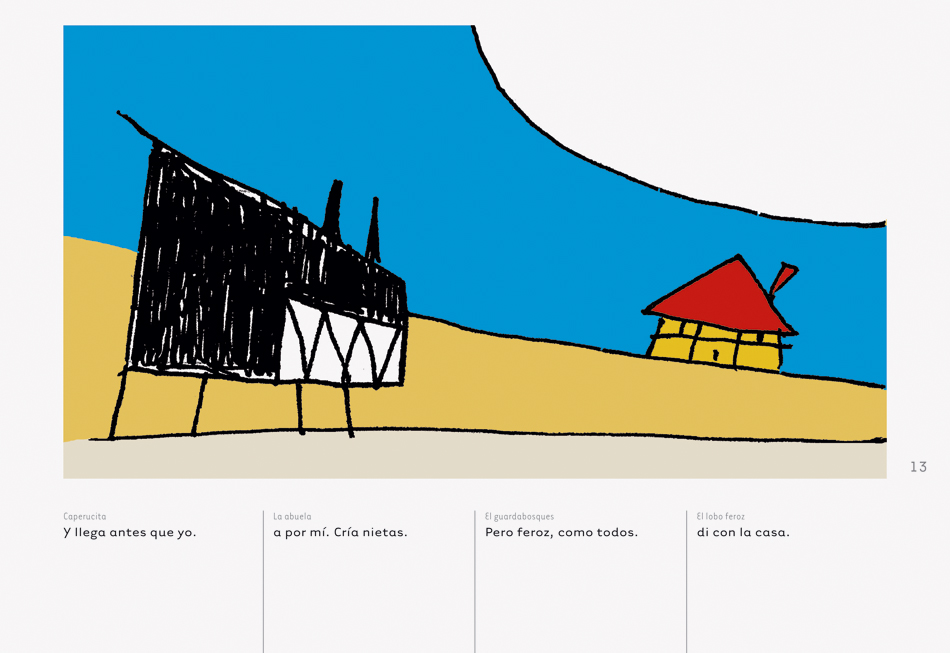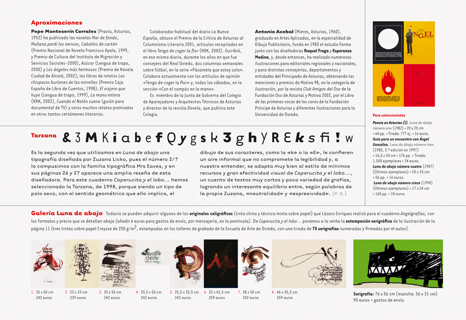 Es la segunda vez que utilizamos en Luna de abajo una tipografía diseñada por Zuzana Licko, pues el número 2/7 lo compusimos con la familia tipográfica Mrs Eaves, y en sus páginas 26 y 27 aparece una amplia reseña de esta diseñadora. Para este cuaderno Caperucita y el lobo… hemos seleccionado la Tarzana, de 1998, porque siendo un tipo de palo seco, con el sentido geométrico que ello implica, el dibujo de sus caracteres, como la «k» o la «E», le confieren un aire informal que no compromete la legibilidad y, a nuestro entender, se adapta muy bien al estilo de mínimos recursos y gran efectividad visual de Caperucita y el lobo…, un cuento de textos muy cortos y poca variedad de grafías, logrando un interesante equilibrio entre, según palabras de la propia Zuzana, «neutralidad» y «expresividad».