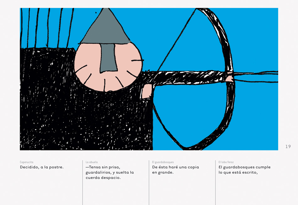El diseñador Antonio Acebal, del estudio Forma, ha realizado una versión visual del cuento eterno de Caperucita Roja. Más que dibujos parecen fotografías del mundo inconsciente, del territorio onírico que a veces nos interroga. Pepe Monteserín ha reescrito este cuento desde ese espacio interior, cerrado y hermético de las ilustraciones, también de sus recuerdos, desde los que afloran las voces cruzadas de un cuento que no deja de crecer.