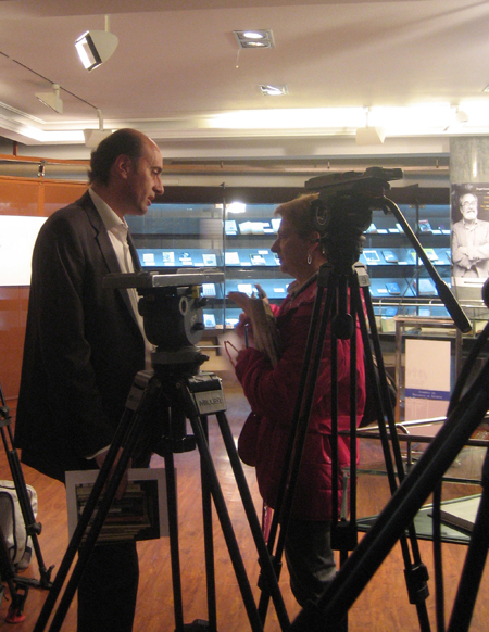 ↑Javier Lasheras con la periodista Pilar Rubiera, de La Nueva España, poco antes del comienzo del acto inaugural de la exposición.