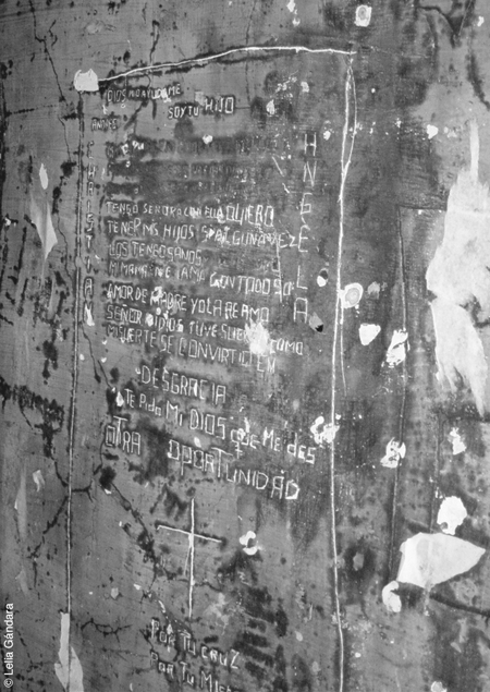 En las paredes de la cárcel de Buenos Aires que estudió Lelia Gándara no hay graffitis realizados con aerosoles o pinturas como las que muestra la imagen que se reproduce sobre estas líneas, prevalecen las inscripciones «realizadas por esgrafiado (raspando la pared)», destacando «la omnipresencia del trabajo de horadación de las paredes alternando con las inscripciones» (pág. 241), como «una búsqueda simbólica de atravesar la barrera que separa el ámbito carcelario del mundo exterior: la pared» (pág. 243).
