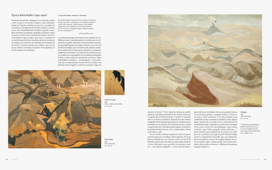2. «El paisaje recreado» (1940-1987). Dada su condición de viajero por tierras de Europa y América, a lo largo de estas décadas Vaquero se enfrenta, según escribe Francisco Egaña, «al paisaje en toda su diversidad. Porque Joaquín Vaquero pertenece a esa estirpe de asturianos que tienen la obsesión de marcharse lejos y retornar. […] La década de los cuarenta se caracteriza por una simbiosis entre América y España, alternando en su pintura los volcanes centroamericanos y las tierras secas de Castilla […]»