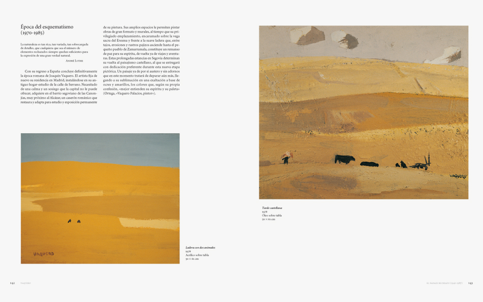 Vaquero se inicia con el prólogo del hijo del artista, Joaquín Vaquero Turcios, también un conocido pintor que ha seguido sus pasos trabajando estrechamente con él. Un texto emotivo que sorprende por las cualidades de su escritura, en la que podemos leer hermosas descripciones como ésta: