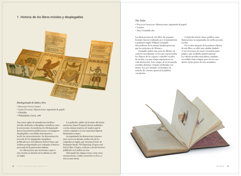 En el segundo capítulo presentan «la variedad tipológica de estas ediciones, atendiendo a los mecanismos de papel que incorporan. En general podemos afirmar que son tres los posibles objetivos de todos estos dispositivos: efectos de movimiento, tridimensionalidad y transformación de imágenes». Se expone en la galería derecha de la Pinacoteca de Langreo y en este espacio han escogido libros «en los que el arte moderno, en sentido amplio, está presente, dando un carácter especial a esta exposición en adecuación y deferencia al lugar en donde se presenta» [Álvaro Gutiérrez, p. 24].