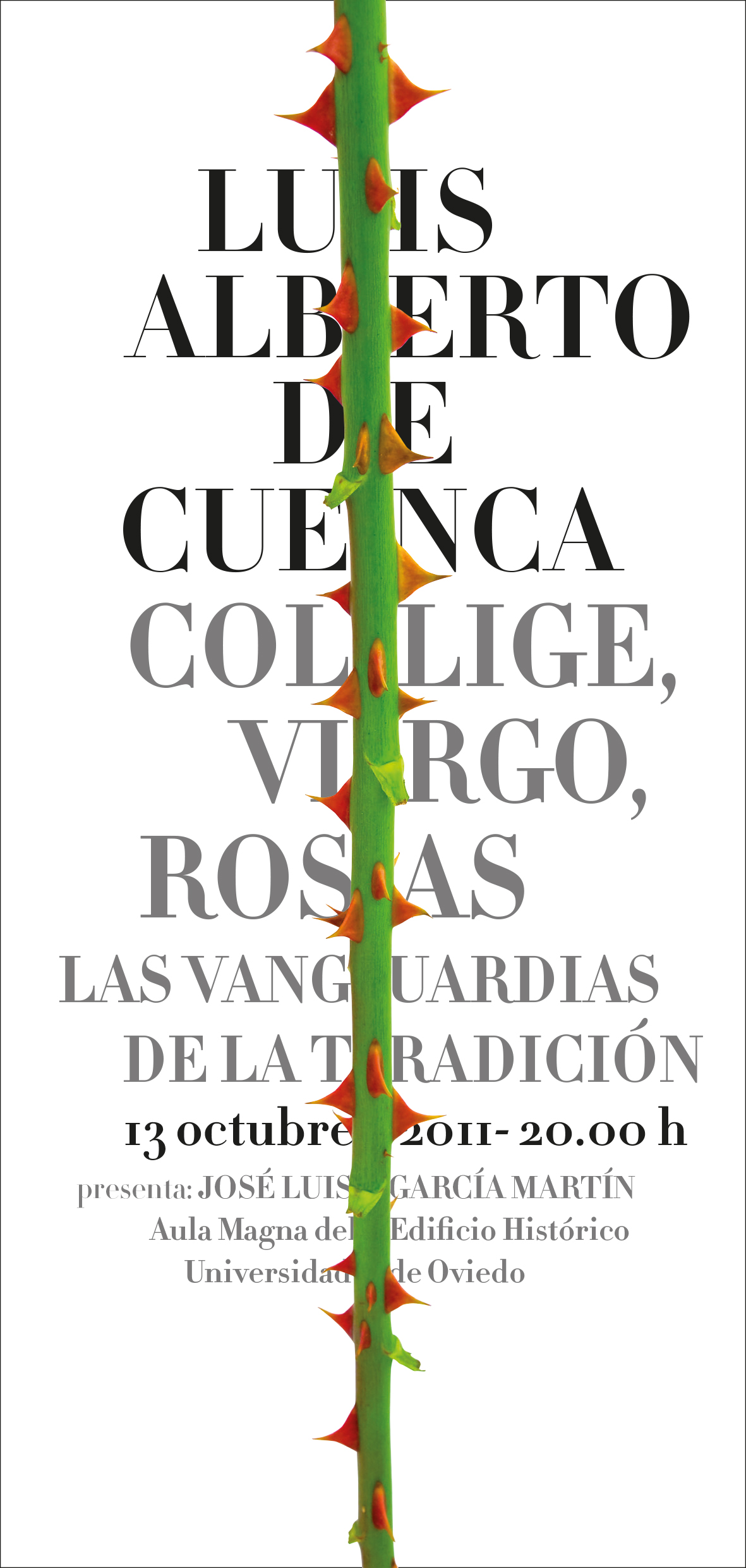 El jueves, 13 de octubre, Luis Alberto de Cuenca impartirá la que será la tercera conferencia del año programada por La Cátedra Emilio Alarcos en 2011. Lleva por título Collige, virgo, rosas. Las vanguardias de la tradición y como es habitual el lugar será el Edificio Histórico de la Universidad de Oviedo (c/ San Francisco, 1. Oviedo).