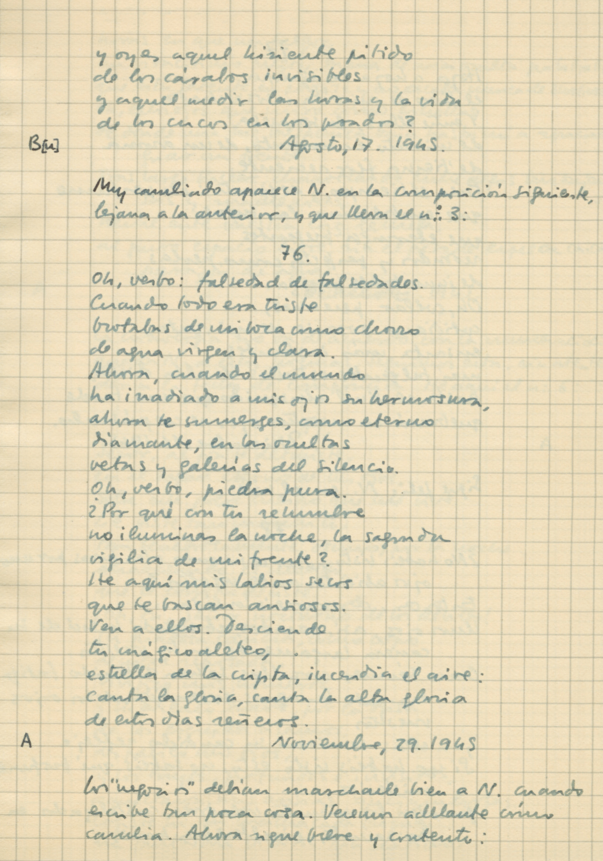 El original de Notas inéditas al Cancionero inédito de A. S. Navarro es un cuaderno de tapas negras y hojas cuadriculadas en el que Emilio Alarcos Llorach copió los poemas que había escrito antes de sus veinticuatro años —1946 es la fecha de las últimas anotaciones—, tomó distancia crítica, adjudicando la autoría de los poemas al heterónimo creado para la ocasión, A. S. Navarro, y los fue comentando con ese estilo tan de Alarcos, lúcido e irónico —la cautivadora fotografía de los carteles y la invitación que nos muestran a un joven Alarcos fumando, incorrecta en estos tiempos, nos parece muy apropiada para publicitar este acto.