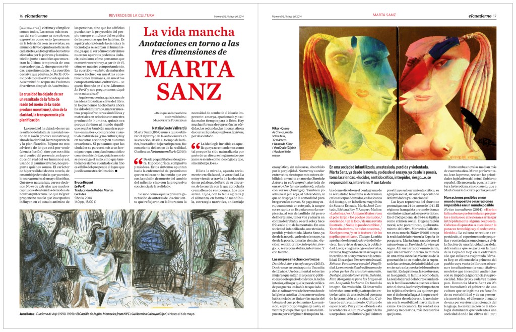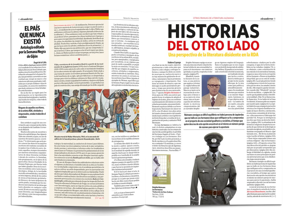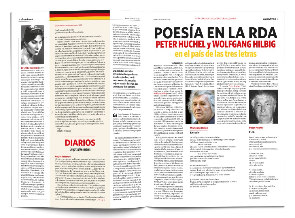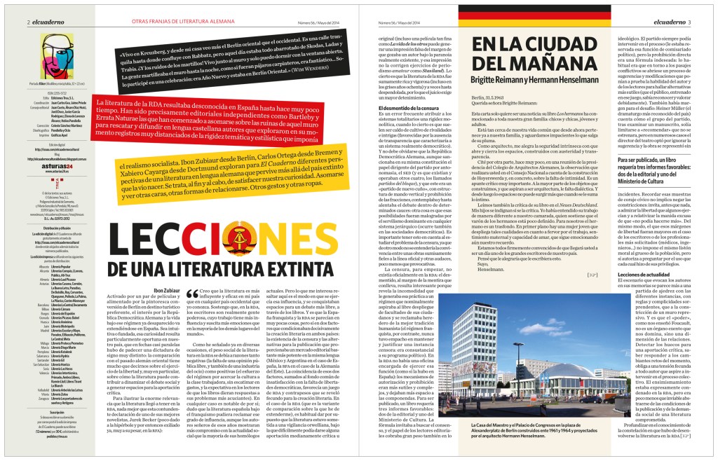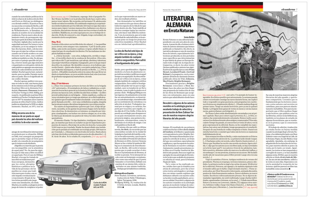 El Cuaderno 56 de mayo del 2013. En la Portada: Kiker (Rodillero, mixta/tabla, 32 × 22 cm). Con el dossier: Otras franjas de la literatura alemana: • «Lecciones de una literatura extinta», por Ibon Zubiaur. • «Poesía en la RDA. Peter Huchel y Wolfgang Hilbigen el país de las tres letras», por Carlos Ortega / Dos poemas. • «Literatura alemana en Errata Naturae», por Irene Antón. • «El país que nunca existió. Antología editada por la Semana Negra de Gijón», por Ángel de la Calle. • «Historias del otro lado», por Xabiero Cayarga. • Antología de textos de Brigitte Reimann y Wolfgang Hilbig. Además de secciones de narrativa —en la que se puede leer una entrevista a Sergio Chejfec—, ensayo, poesía —con cuatro páginas dedicadas a Juan Ramón Jiménez—, televisión y arte.