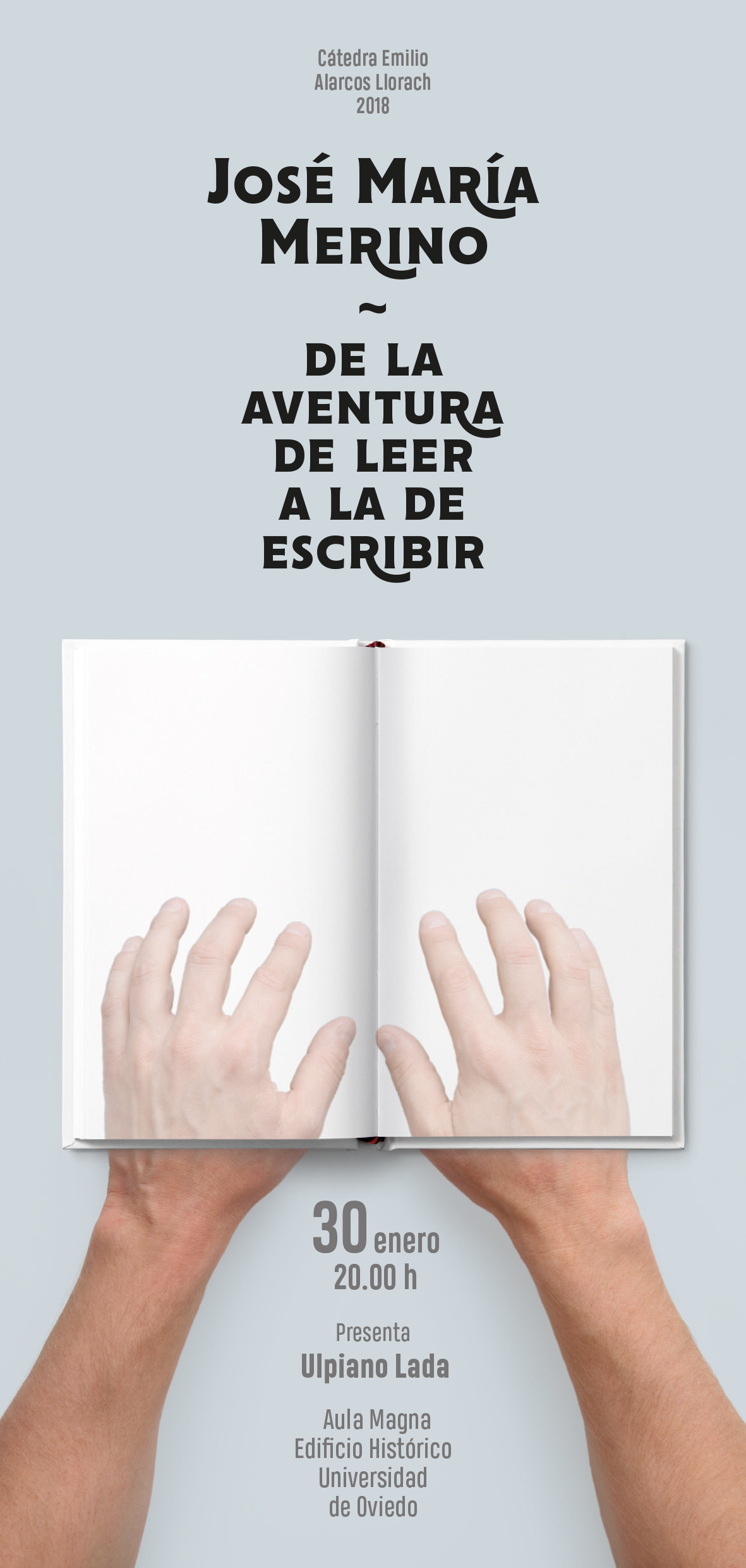 Conferencia programada por la Cátedra Emilio Alarcos Llorach titulada De la aventura de leer a la aventura de escribir e impartida por José María Merino, escritor y académico de la RAE, el 30 de enero de 2018