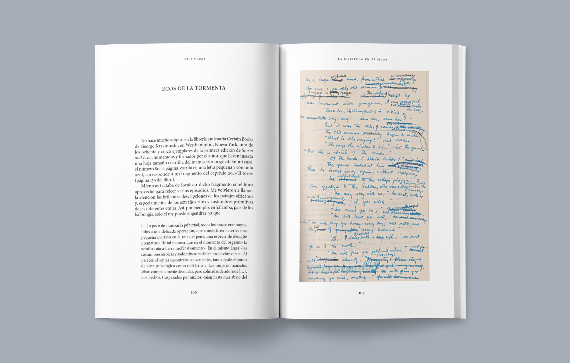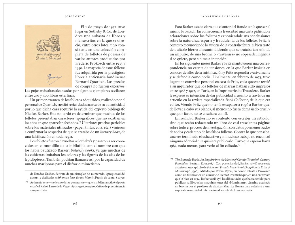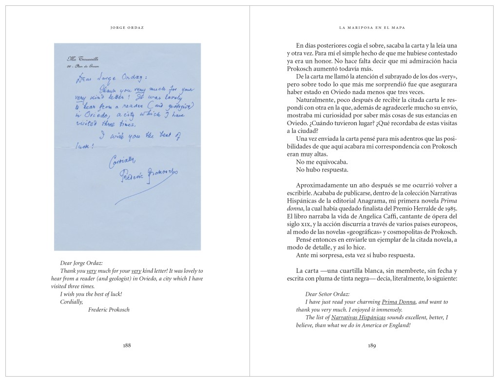 […] Lo que he pretendido con la escritura de La mariposa en el mapa, además de rendir mi pequeño homenaje como lector a este escritor [Frederic Prokosch] al que encuentro particularmente fascinante y que me ha acompañado con intermitencias durante largo tiempo, es arrojar un poco de luz sobre su vida y su obra, de modo que al menos por unos momentos su nombre vuelva a brillar aunque sea de una forma efímera, como las mariposas a las que tan aficionado era a cazar y a coleccionar.
