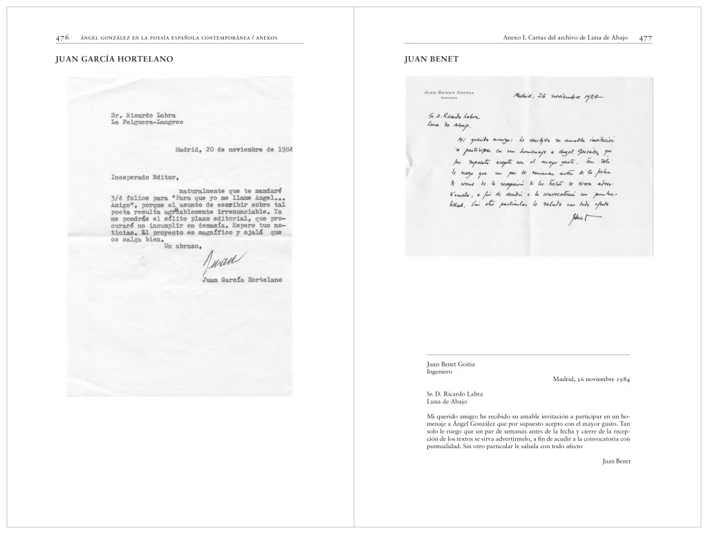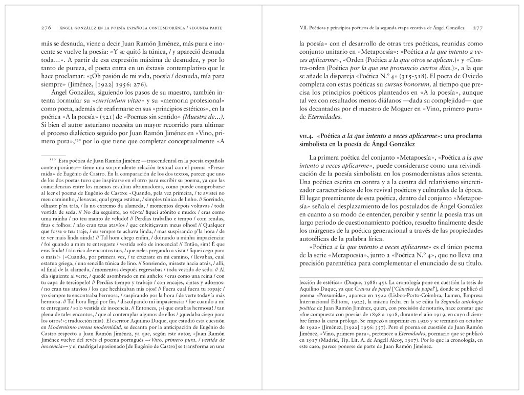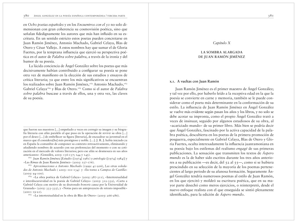Preguntas que han motivado y orientado los múltiples desarrollos de este estudio sobre Ángel González, siempre desde el planteamiento de que leer la obra poética del autor de Palabra sobre palabra significa al mismo tiempo releer la mejor poesía de nuestra tradición literaria. Este es el punto de partida y también de confluencia, la principal idea rectora que subyace y prevalece en cada uno de los aspectos que se analizan en Ángel González en la poesía española contemporánea, con el objeto de realizar una reinterpretación teórica de los sucesivos desplazamientos, no solo de la poesía del autor asturiano, sino de la poesía española contemporánea.