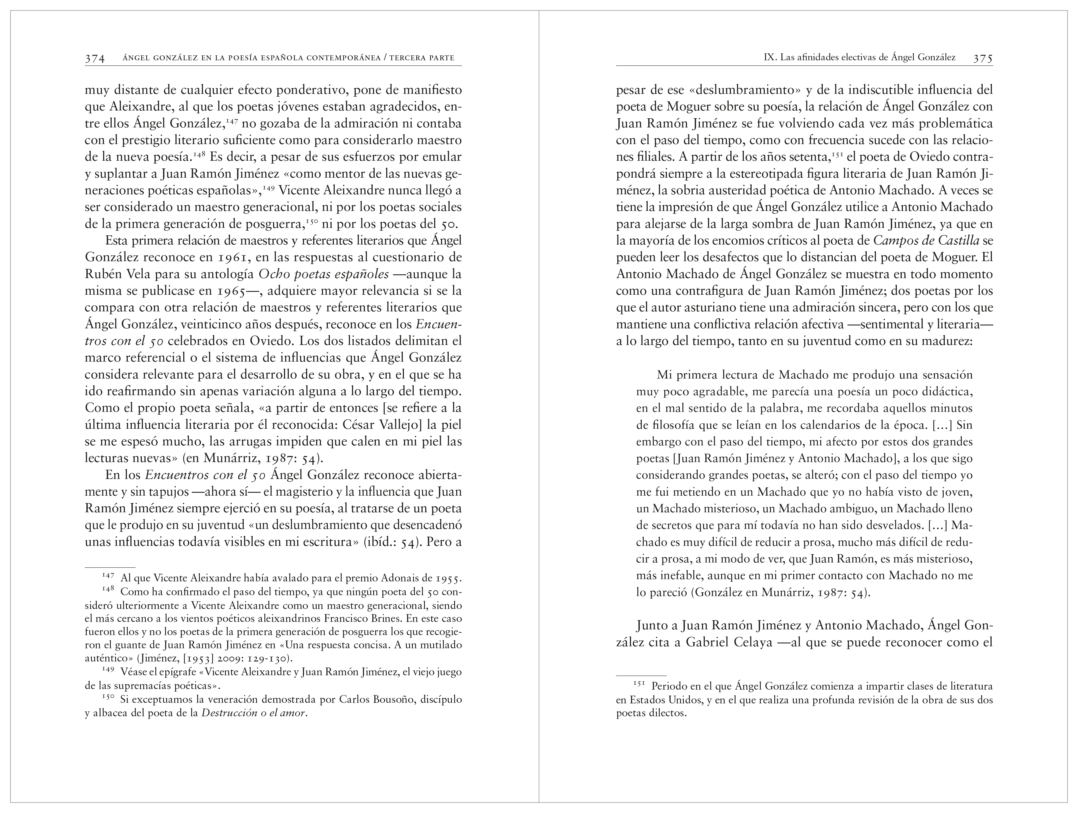 Preguntas que han motivado y orientado los múltiples desarrollos de este estudio sobre Ángel González, siempre desde el planteamiento de que leer la obra poética del autor de Palabra sobre palabra significa al mismo tiempo releer la mejor poesía de nuestra tradición literaria. Este es el punto de partida y también de confluencia, la principal idea rectora que subyace y prevalece en cada uno de los aspectos que se analizan en Ángel González en la poesía española contemporánea, con el objeto de realizar una reinterpretación teórica de los sucesivos desplazamientos, no solo de la poesía del autor asturiano, sino de la poesía española contemporánea.